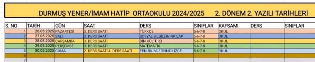 2024/2025 EĞİTİM ÖĞRETİM YILI 2. DÖNEM 2. YAZILI SINAV TARİHLERİ
